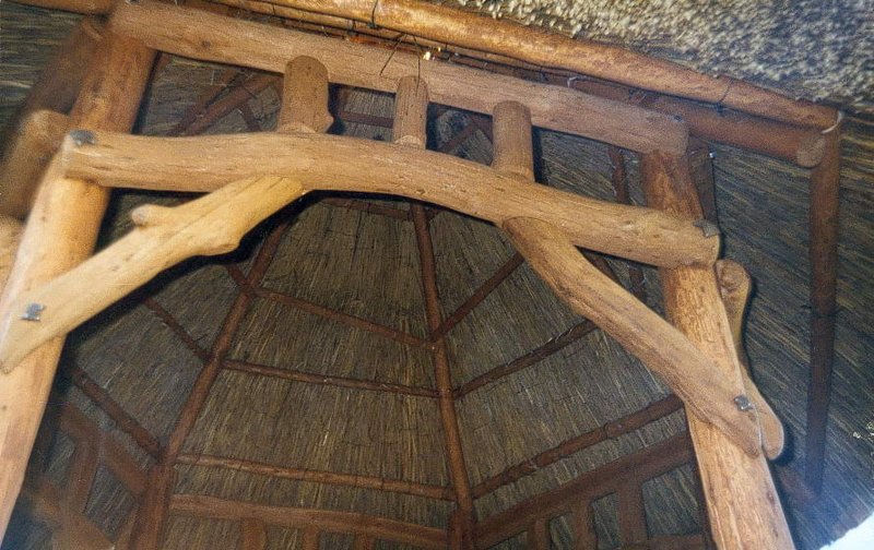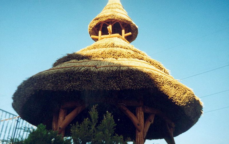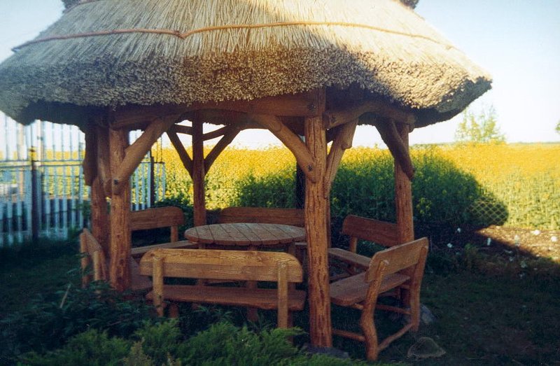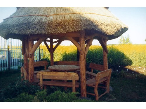 Masywna ,solidna altanka ogrodowa.Konstrukcja drewniana z okrąglaków.Dach kryty trzciną.Dopełnieniem są drewniane meble ogrodowe.