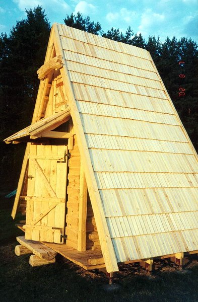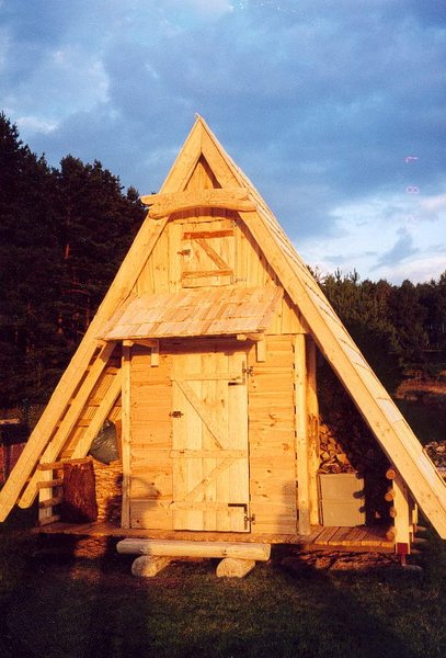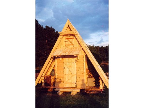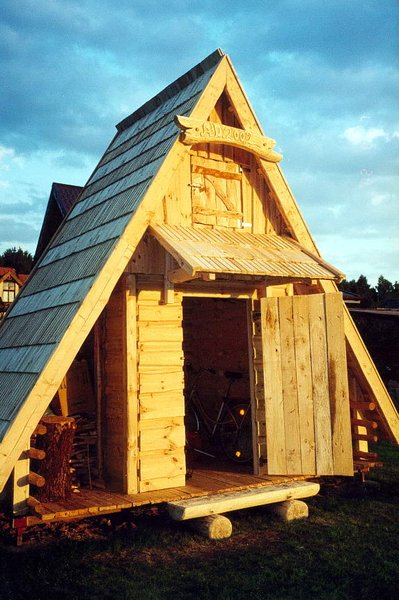 Drewutnia w stylu domku.Cała z drewna.W Srodku pomieszczenie na narzędzia gospodarcze,rowery i.t.p.Po bokach miejce na drewno.Na piętrze dodatkowe pomieszczenie,z wejściem po drabinie