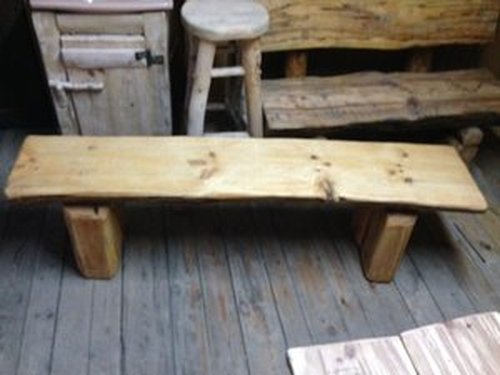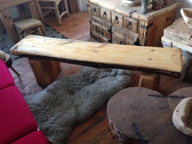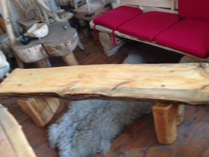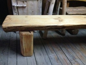 Ławka drewniana z półbala na grubych nogach -pieńkach.Wymiarydługość 160 cm szerokość 35 cm wysokość 45 cm